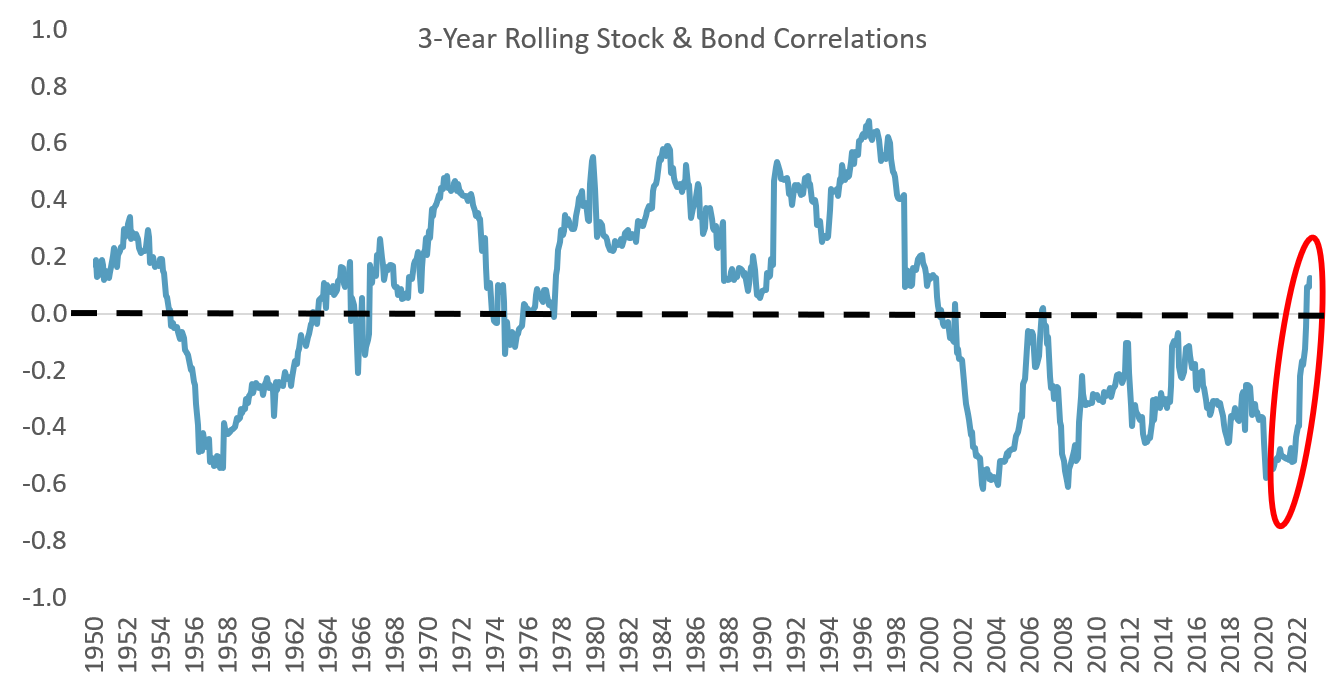 Over the last two decades, stocks and bonds have reliably diversified one another. In 2008, for example, when stocks fell 42%, investment-grade bonds appreciated 5%. This relationship, however, has recently changed. Specifically, the correlation coefficient of stocks and bonds, which had been negative for 20 years, shot up rapidly in 2021-2022, turning positive. This represents a return to the correlation relationship between stocks and bonds that had prevailed in the 40 years before the year 2000.