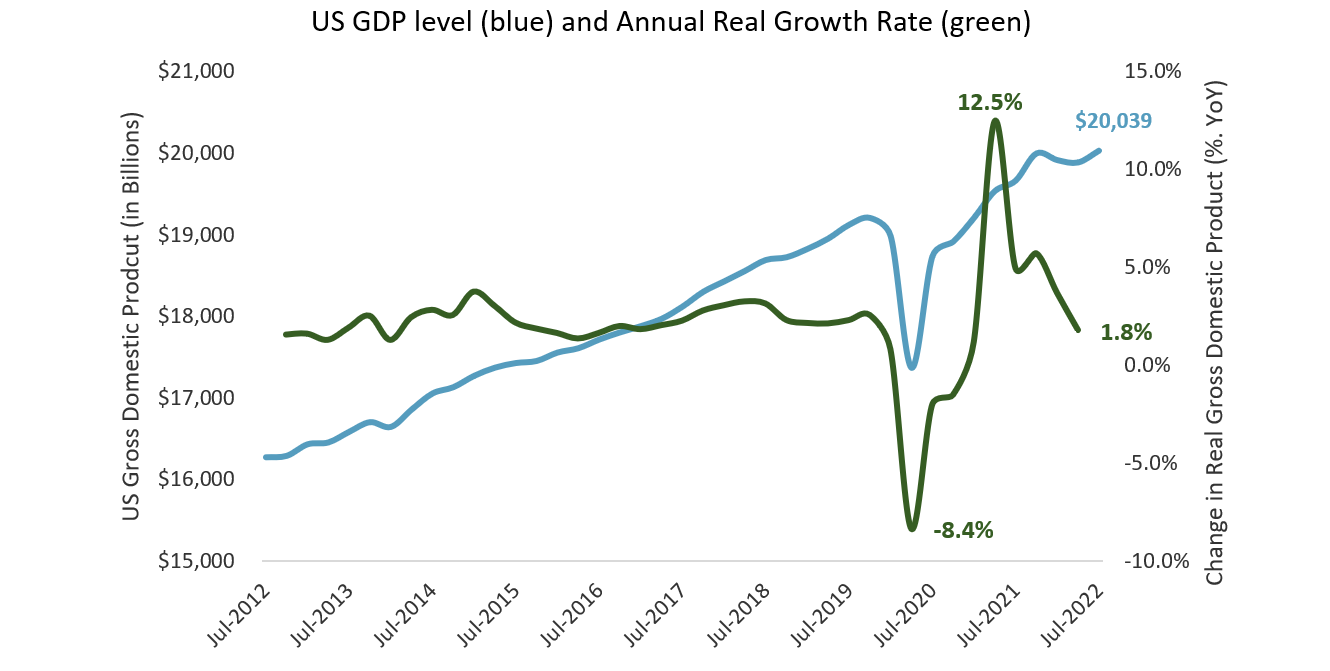 U.S. real Gross Domestic Product (GDP) is at its highest level in history, but the growth rate of GDP has been inconsistent and has slowed over the last several quarters. The COVID-19 pandemic caused a low point in annualized GDP growth (-8.4%), but GDP growth quickly rebounded, to 12.5%. Now, GDP growth rates are positive but have slowed down as consumers, companies, and governments adjust their spending habits to the current economic climate. This includes rising prices, increased unpredictability, and uncertainty about the value of assets.