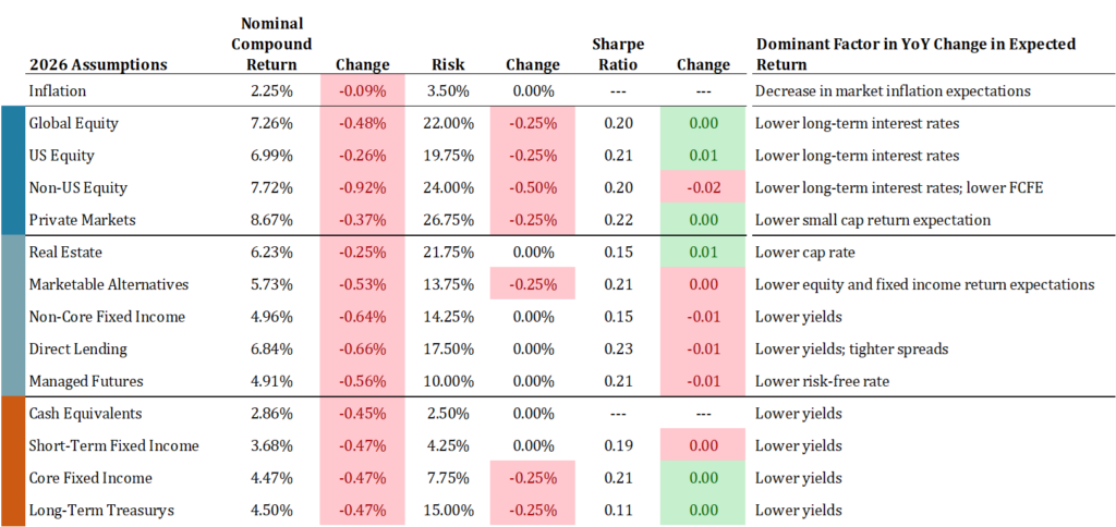We update our capital market assumptions annually. This year, we reduced our return expectations for every major asset class. The primary driver of this shift is straightforward: fixed income yields declined. Because yields serve as the baseline from which we build all other asset class assumptions, lower starting yields naturally pull our broader expectations down with them. In the long run, bond returns follow their starting yields, and our methodology honors this principle. 2025 was a banner year for both US and international stock markets. Some of the exceptional return was earnings improvement, but some of it was multiple expansion — or an increase in the amount of dollars investors were willing to pay for the market’s dollar of earnings. This multiple expansion component borrows from future return, so we reduced future return expectations accordingly.