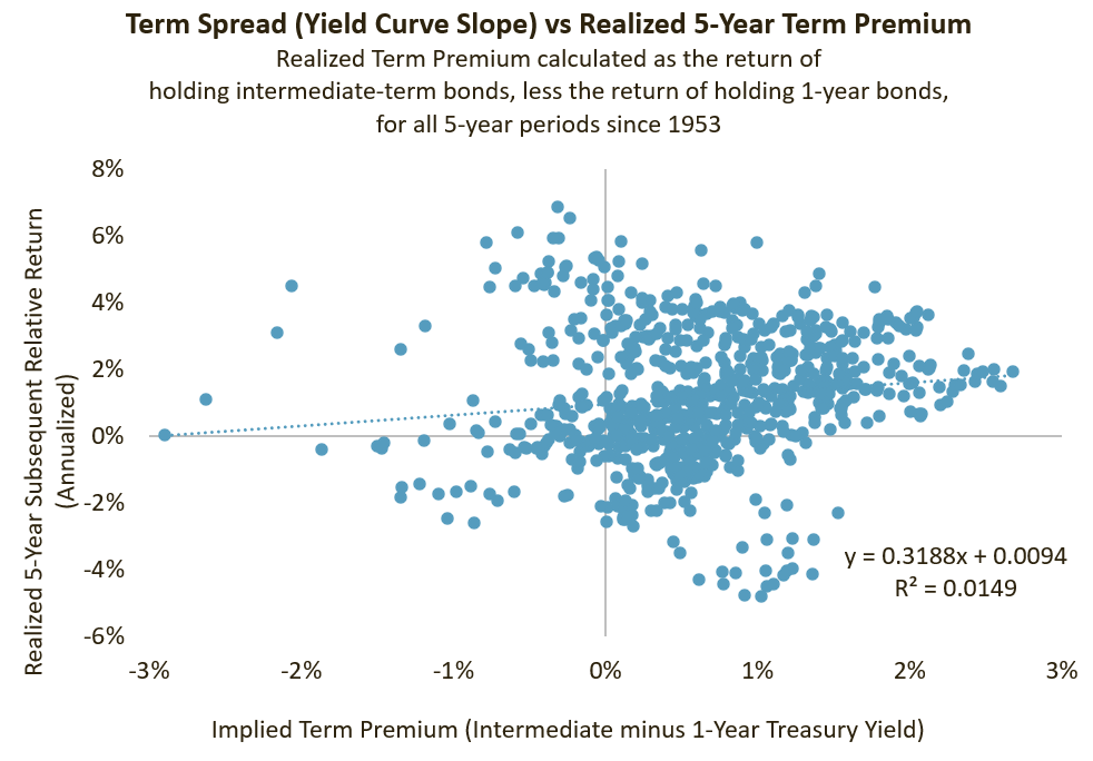 What we actually found, however, reinforces the lesson from our prior simple thought experiment: relative bond returns over a given horizon are determined only minimally by the shape of the yield curve at the outset. We define the “Implied Term Spread” as the shape of the yield curve at any point in time – the difference between the 5-year Treasury yield and the 1-year Treasury yield. We define the “Realized Term Premium” as the higher return that investors actually experienced, subsequently, by investing in the single 5-year Treasury bond instead of the series of sequential 1-year Treasury bonds. In the analysis below, we translated our thought experiment into a real-world analysis, using an intermediate Treasury index as a proxy for 5-year Treasurys and a one-year Treasury index to represent 1-year Treasurys.